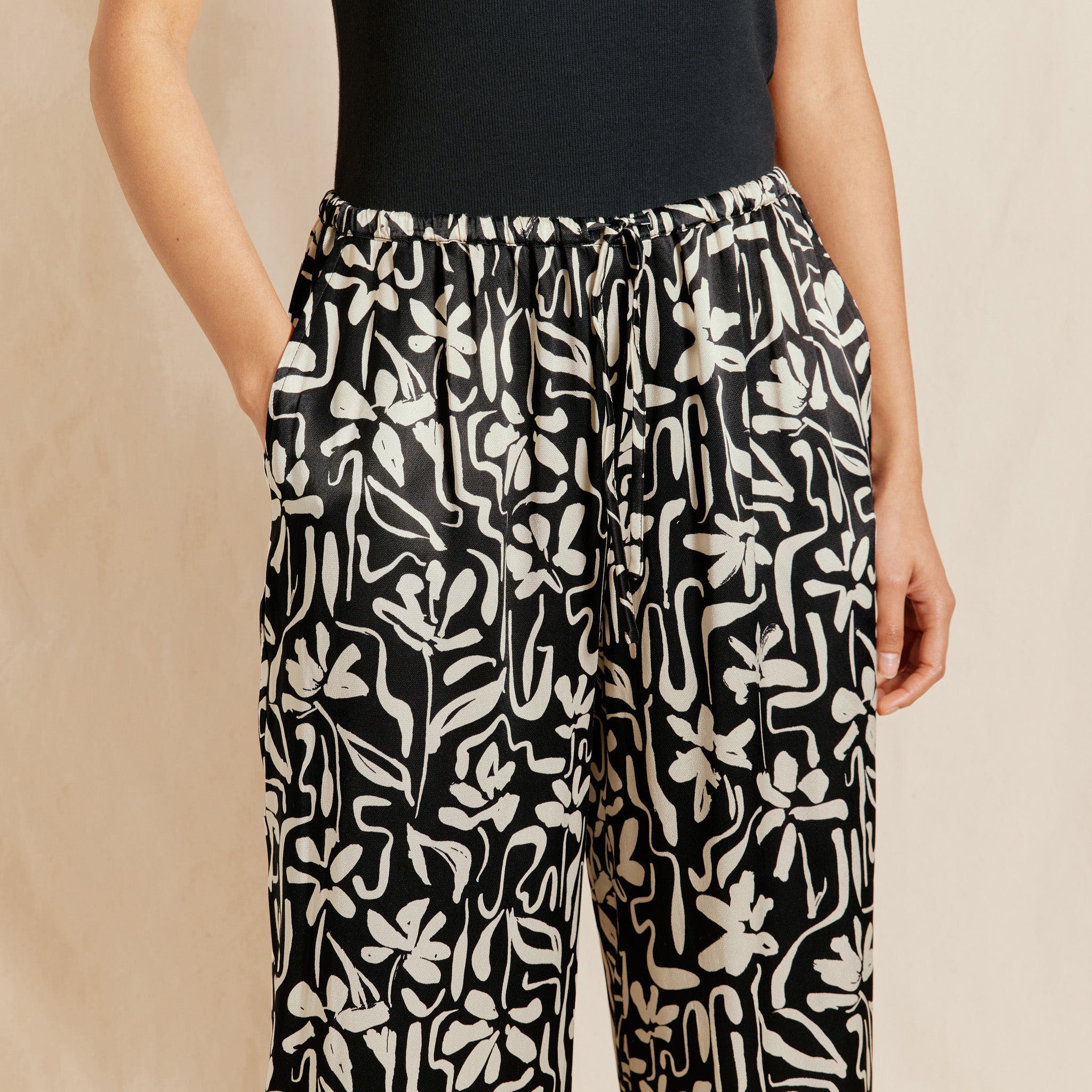This trouser is a stylish and versatile addition to any wardrobe. The elasticated waist provides a comfortable fit, while the side pocket adds functionality in a unique black & cream floral print in luxurious satin.