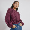 A long sleeved blouse designed with a frill stand collar and button front. The sleeves gently blouson to the cuff with a button fastening. In a modern burgundy and cream spot print, wear tucked in to accentuate the waist or loose for a relaxed look.