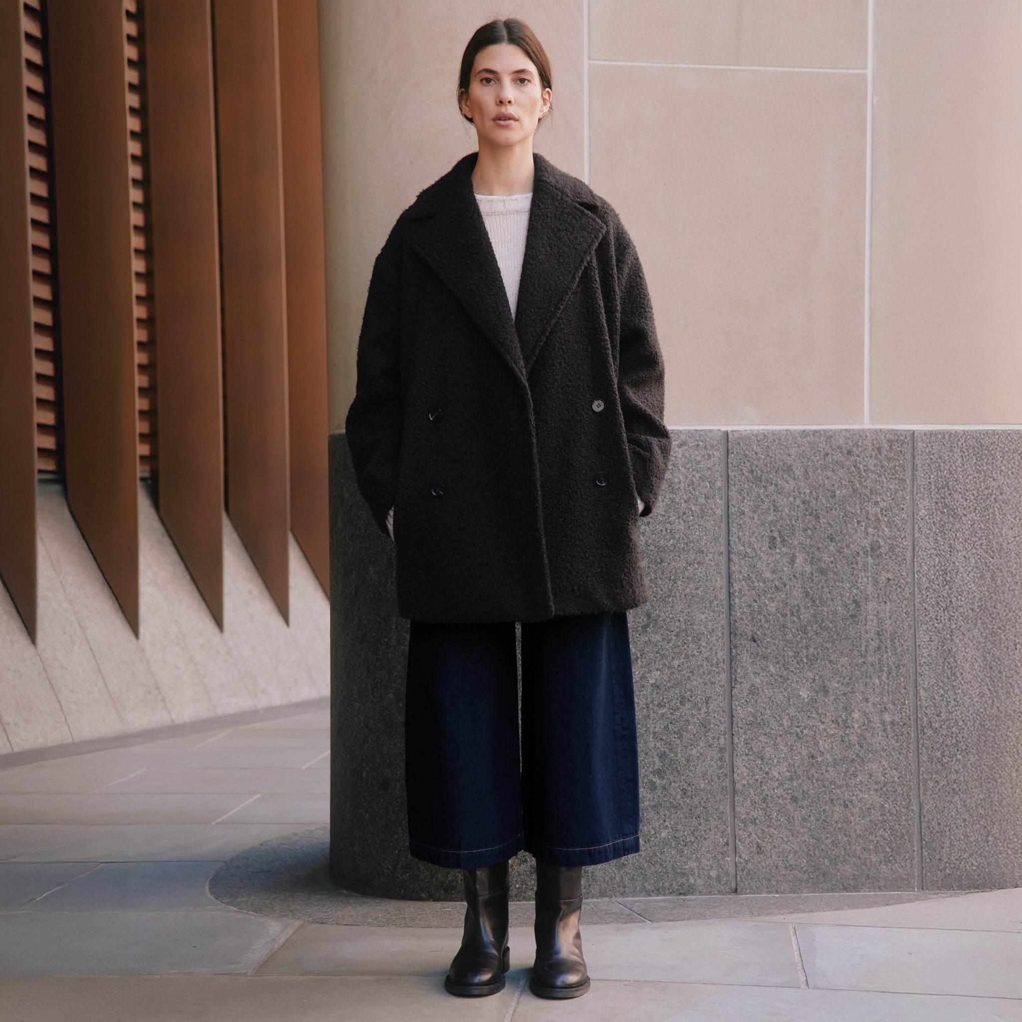 This coat in a deep chocolate shade features a plush curly fabric that feels soft and warm. Designed with a double-breasted front, classic notch lapels, and gently padded shoulders, it offers a timeless silhouette. Fully lined and oversized, it easily fits over your favourite knitwear. Practical details include two pockets and stylish horn-effect buttons, making it both functional and fashionable.