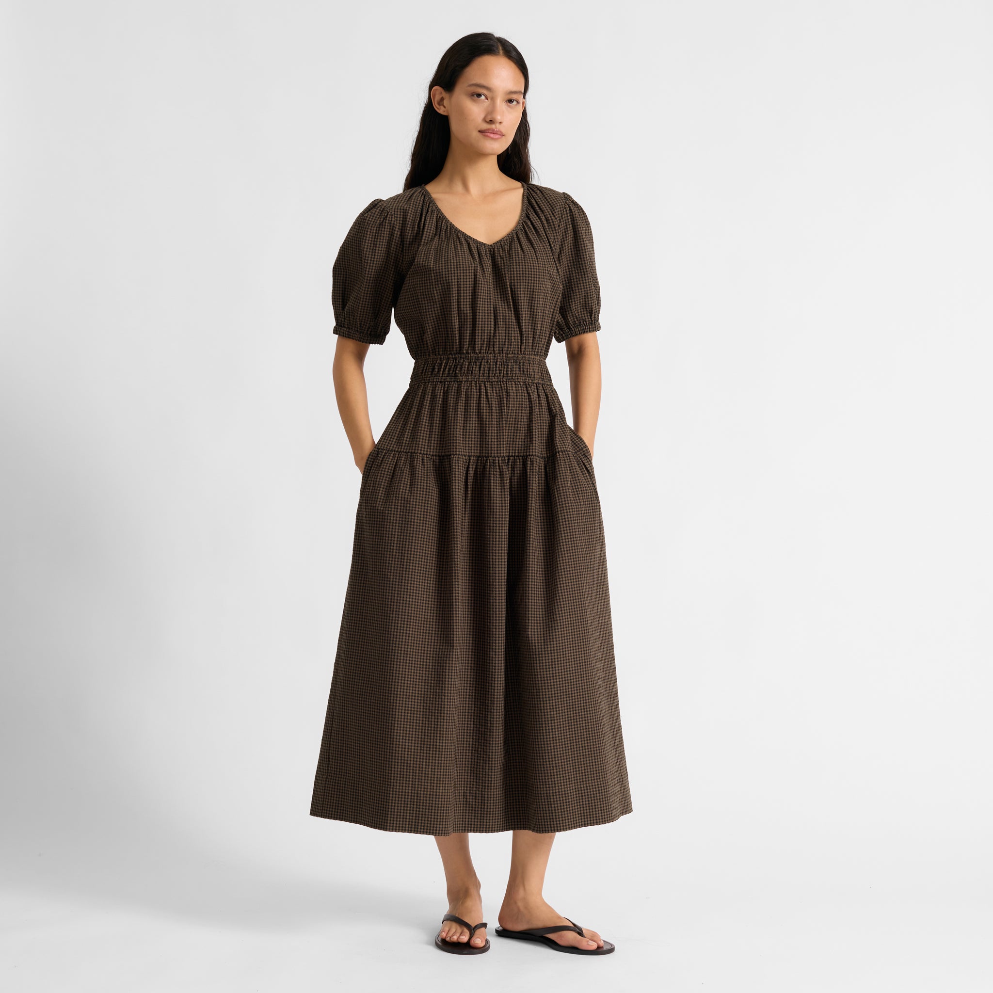 This chocolate and black gingham midi dress is crafted from 100% organic cotton for breathable comfort and easy wear. Designed with a flattering shirred waist, gathered neckline and elasticated blouson sleeves, it’s finished with practical side pockets. A timeless silhouette that balances refined detailing with relaxed, everyday elegance. Wear with sandals or trainers for versatile day-to-evening style.