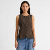 Organic cotton gingham waistcoat in black and chocolate. Features a five-button closure, curved hem with pleats, and adjustable tie back for a refined fit.