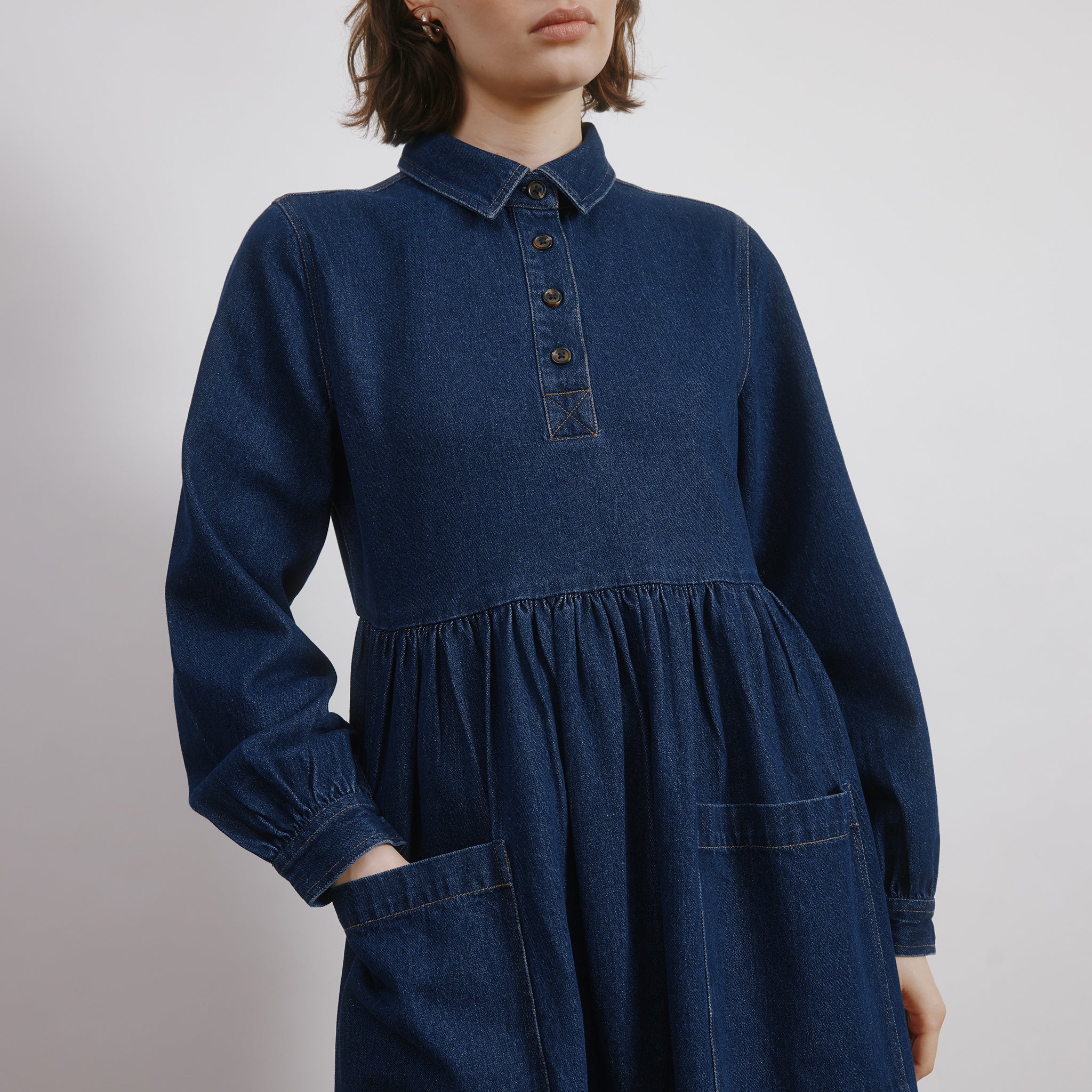 A long sleeved midi dress crafted from 100% Organic Cotton denim. Featuring a collar and half button placket, flattering empire waist detail and front patch pockets.