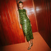 This elegant midi skirt is adorned with large drop sequins in a distinctive olive green that reflect light elegantly, producing a shimmering effect as you move.
