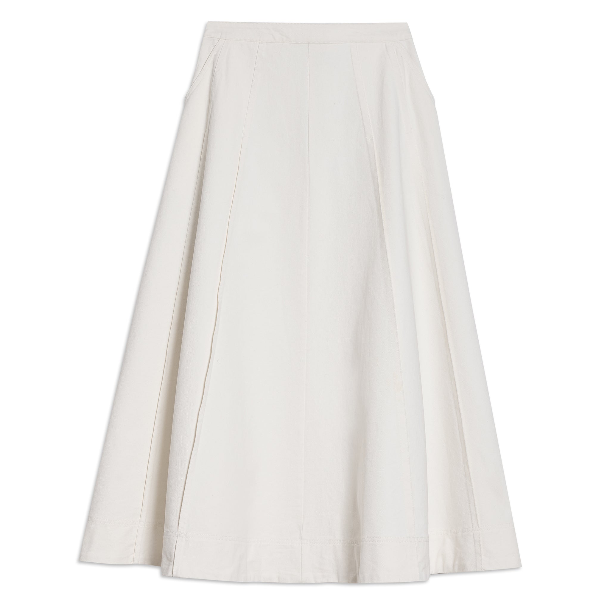 Our expertly crafted denim midi skirt, designed with a subtle seam detail in soft Ecru, exudes contemporary elegance. Cut in a flattering A-line silhouette, it pairs effortlessly with casual summer basics or its co-ordinating T-shirt, bringing timeless versatility to any wardrobe. Your Summer's new essential.