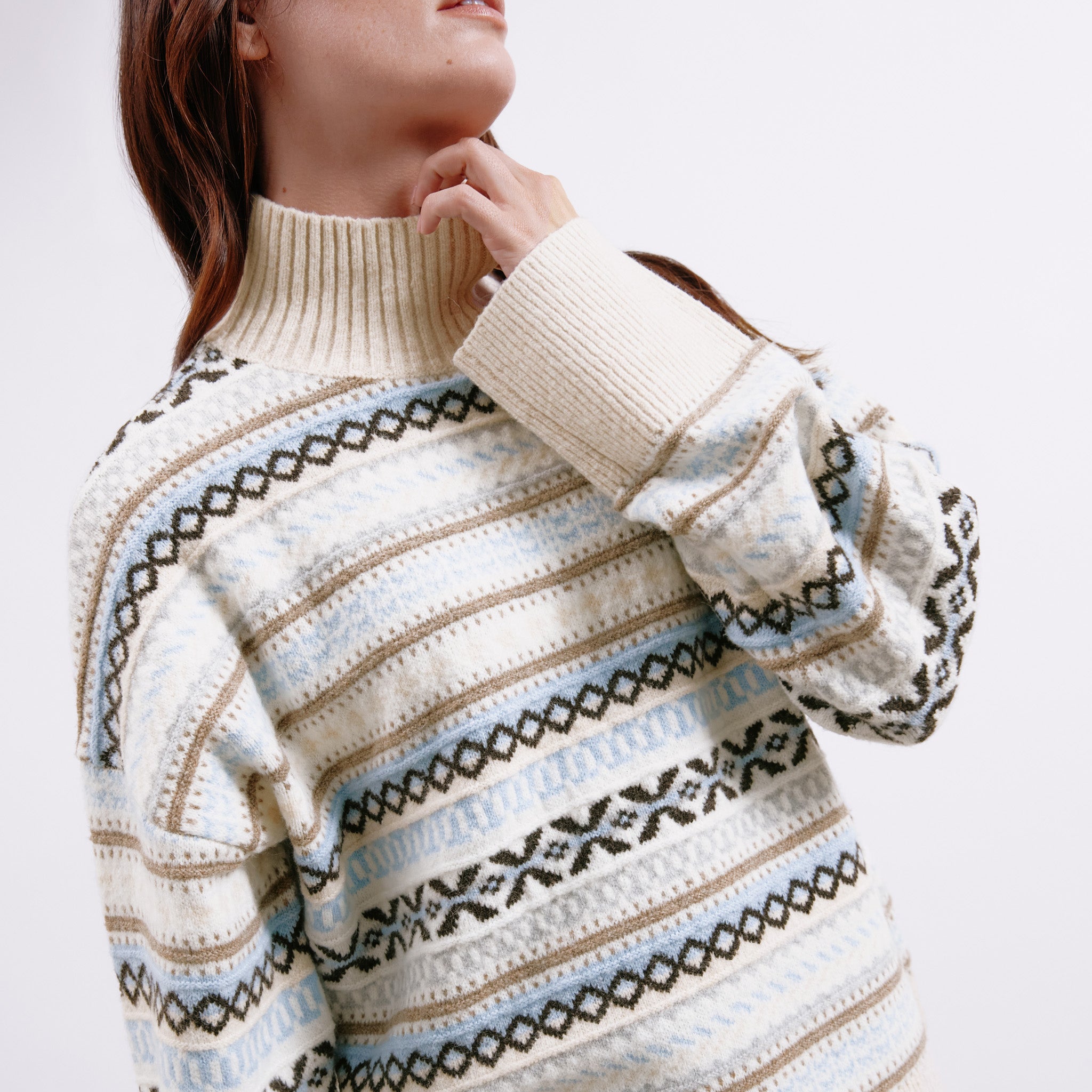 This fair Isle turtle neck jumper combines soft blue, cream, and natural tones with dropped shoulders, contrast cuffs and hem with a turtle neck for the perfect blend of comfort and style.
