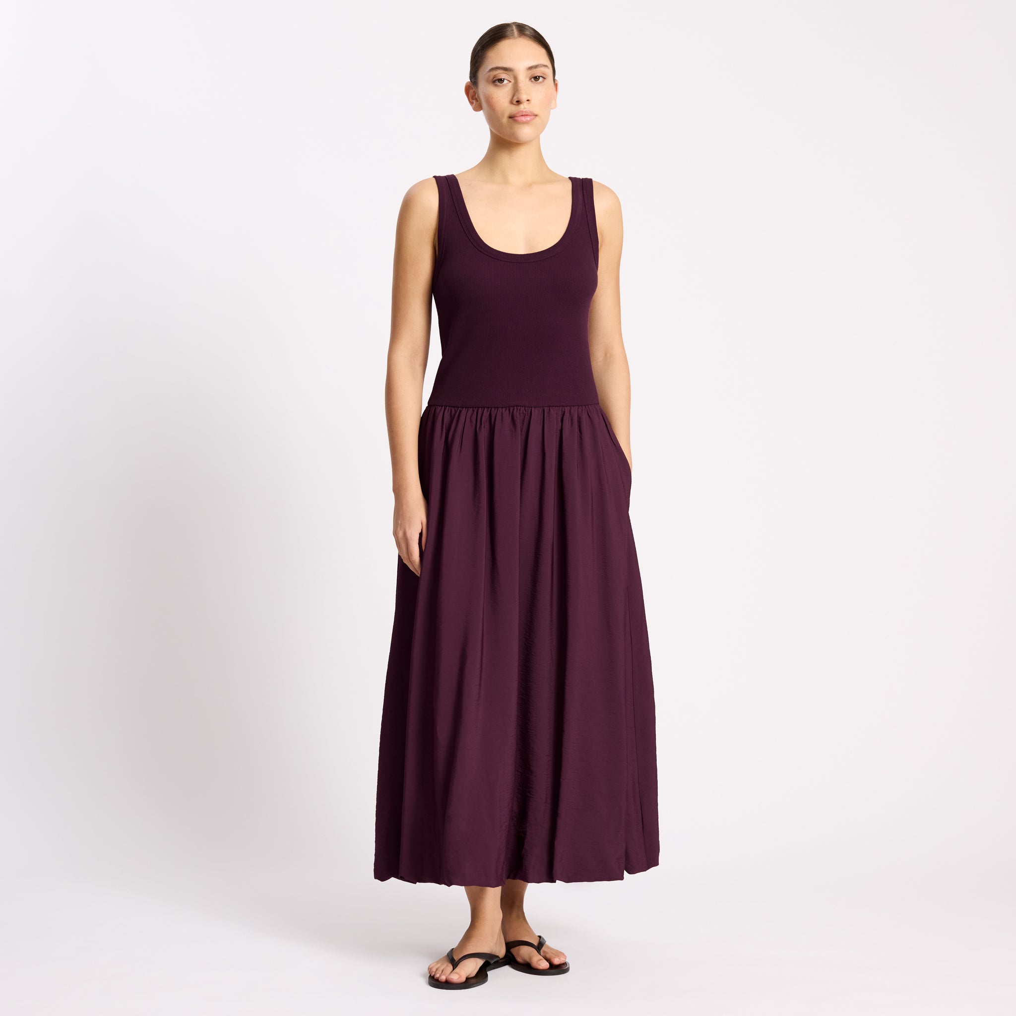 A fig coloured midi dress that blends a soft ribbed jersey vest with a woven cotton skirt for effortless elegance. Designed with a bubble hem, it adds volume and dimension, creating a modern, feminine silhouette. Finished with side pockets for a perfect balance of style and ease.