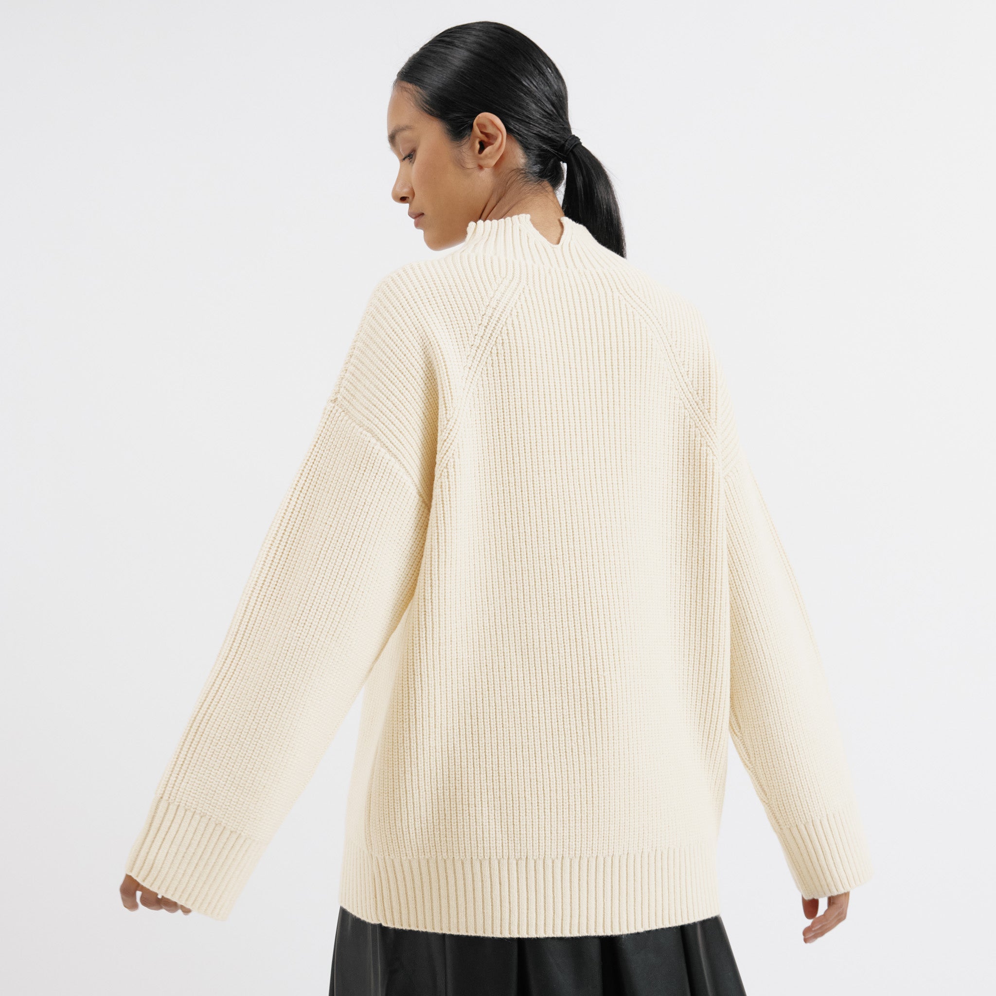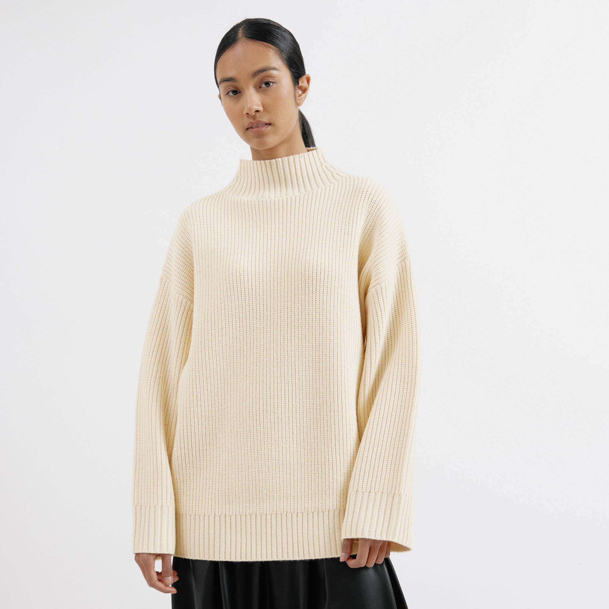Indulge in the warmth and style of our luxurious oversized ribbed jumper. The lofty and warm cream yarn adds an extra touch of sophistication to this must-have piece.