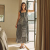This beautiful sundress features a patchwork stripe design, a square neckline, and wide straps that can be adjusted for the perfect fit. The shirred back ensures a comfortable and flattering look, while the soft A-line shape creates a simple yet elegant silhouette. Plus, it even has side pockets for added convenience.