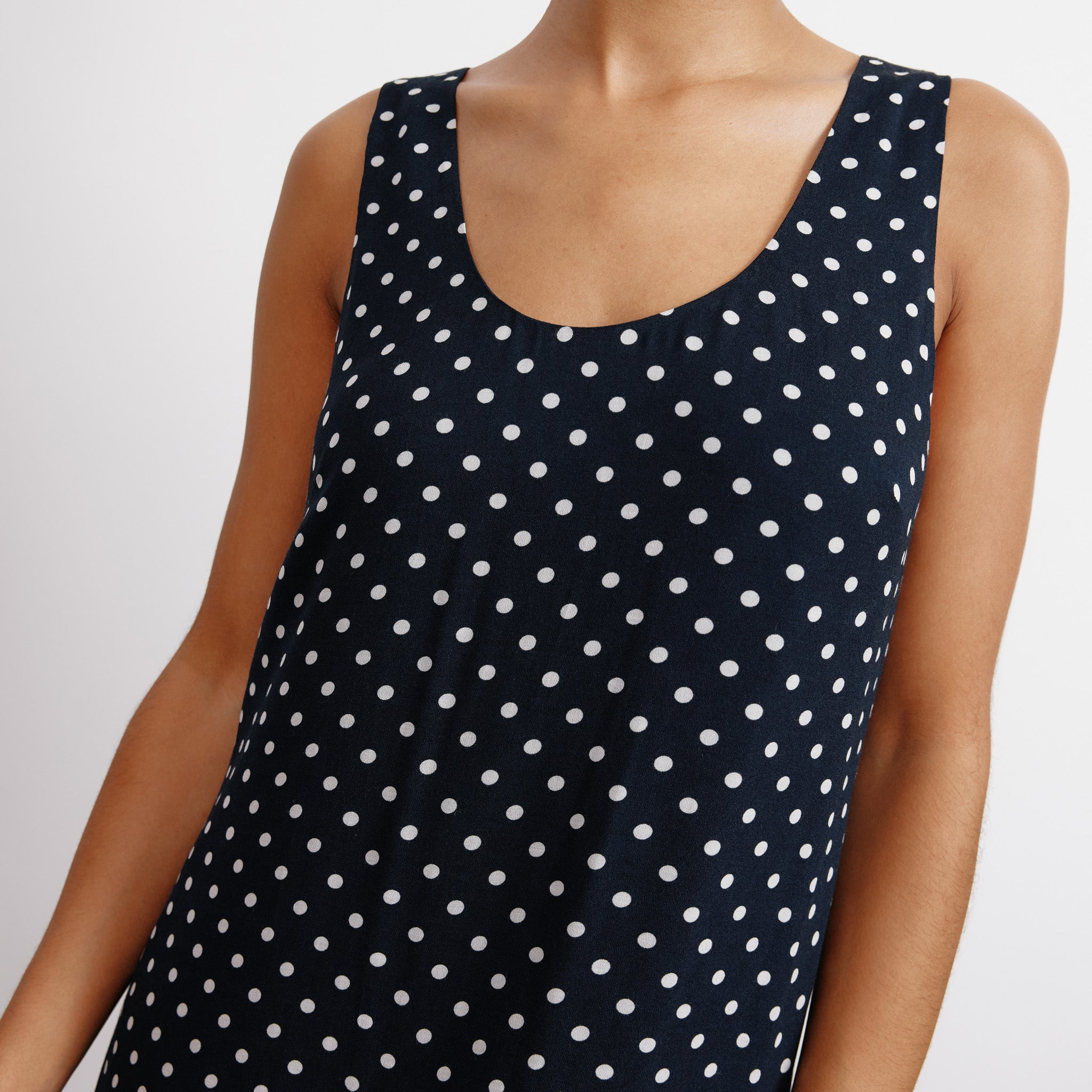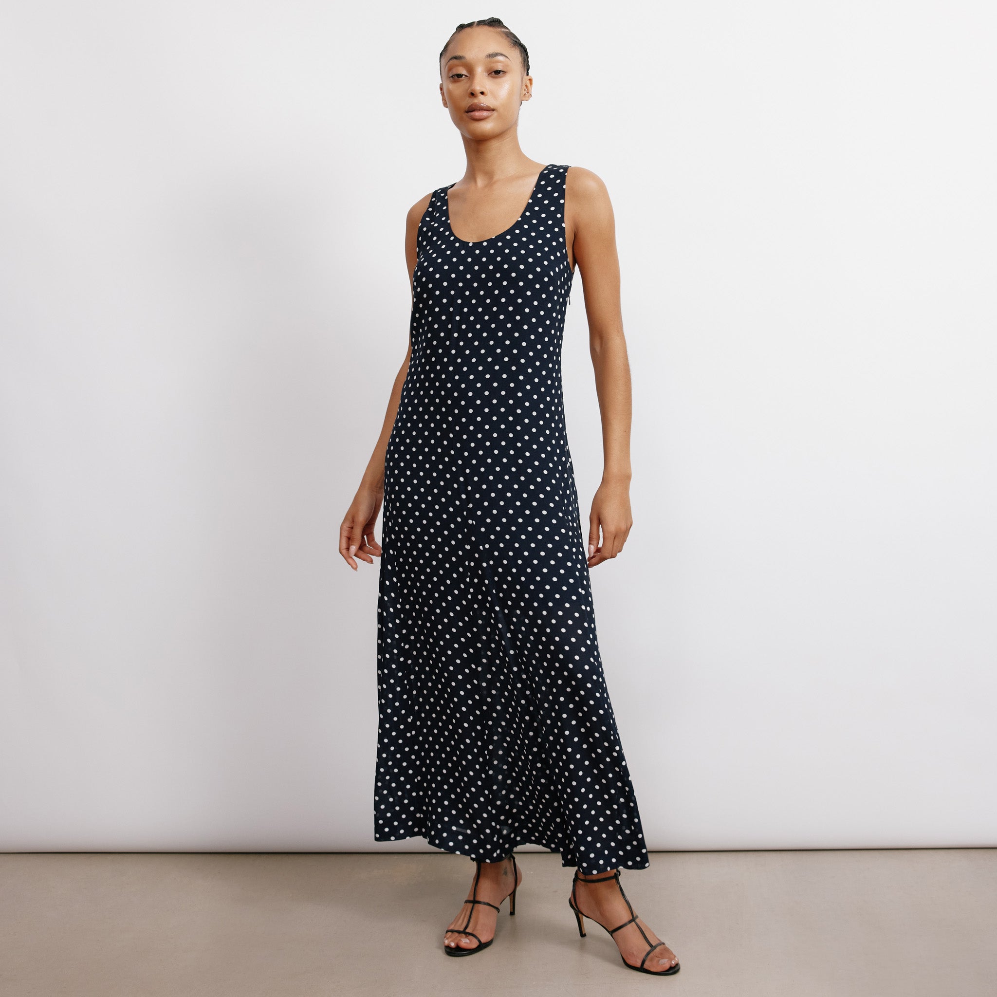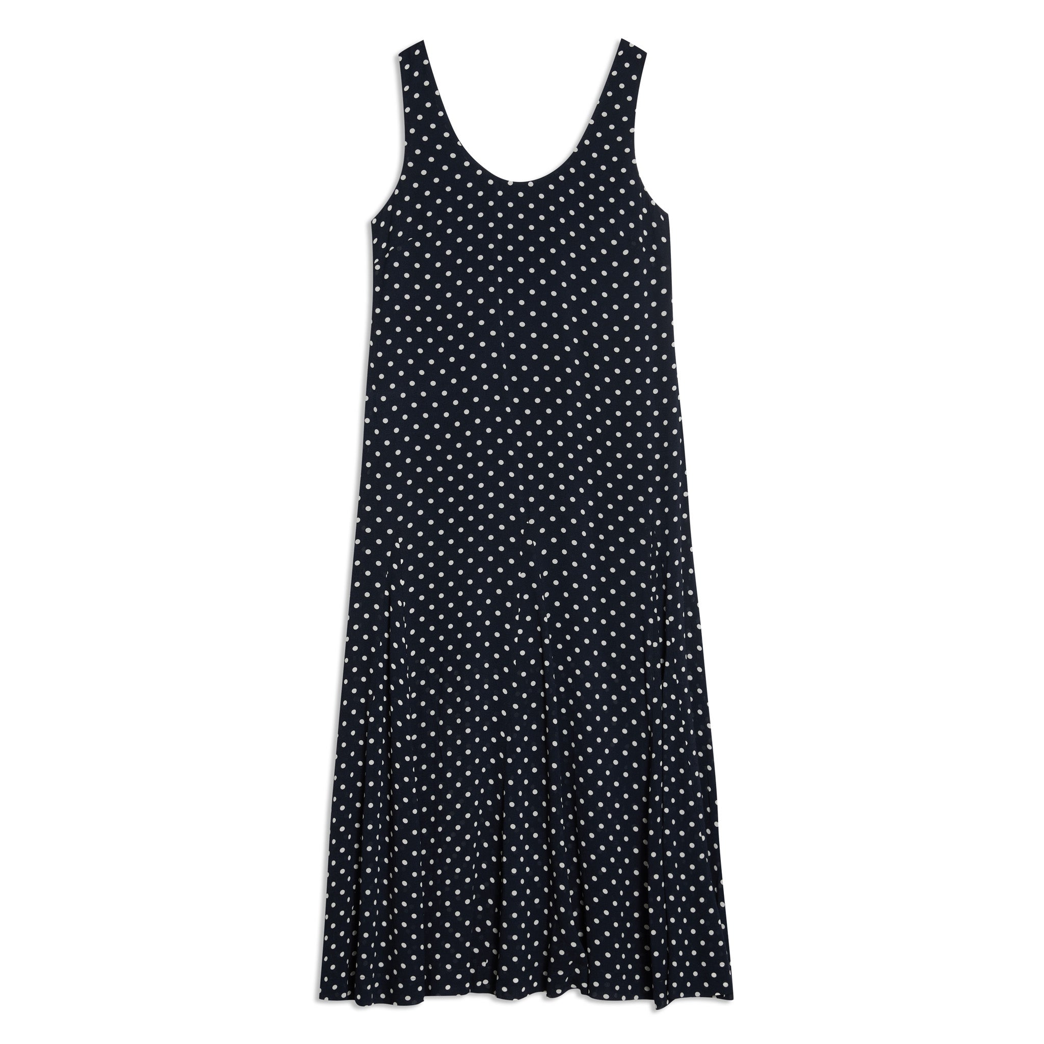 Indulge in the timeless elegance of this sleeveless maxi dress, featuring a classic navy and cream spot design, a flattering scoop neck line, and godets for effortless twirling. With a concealed side zip fastening and half lining, wear with style and ease.