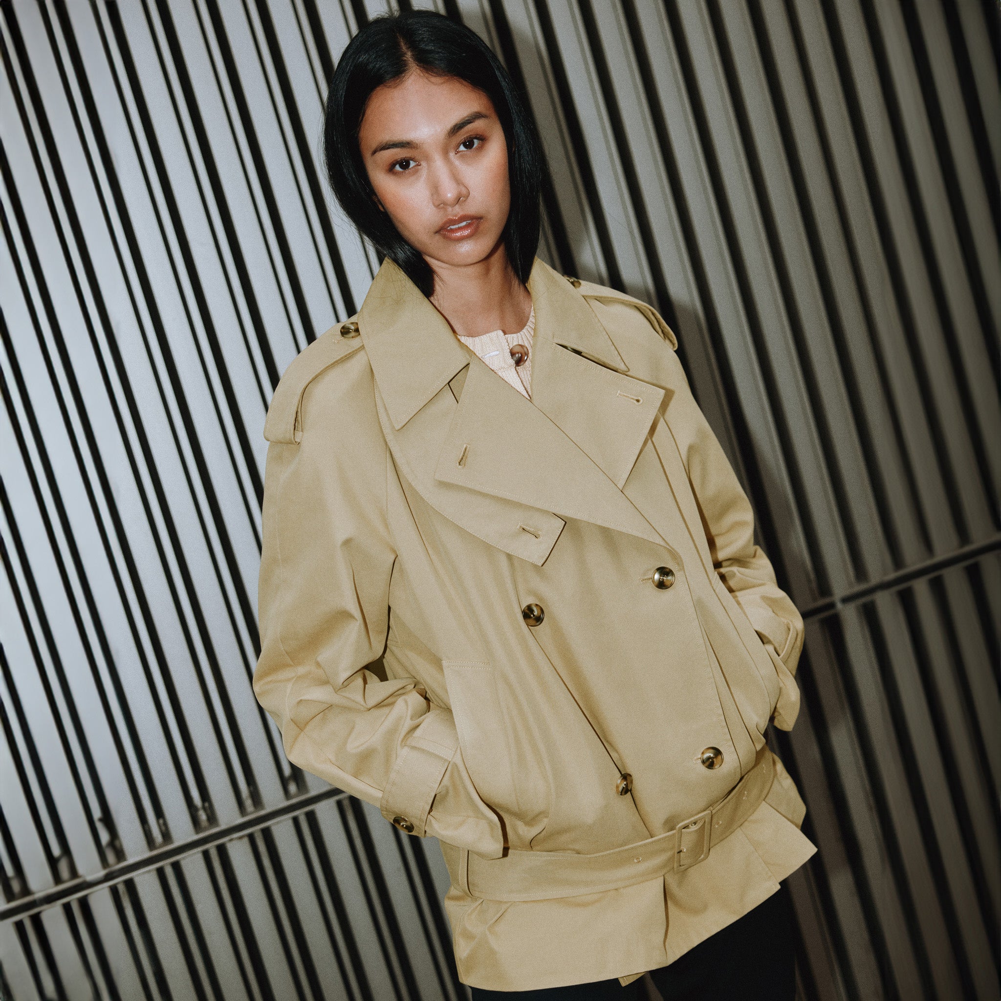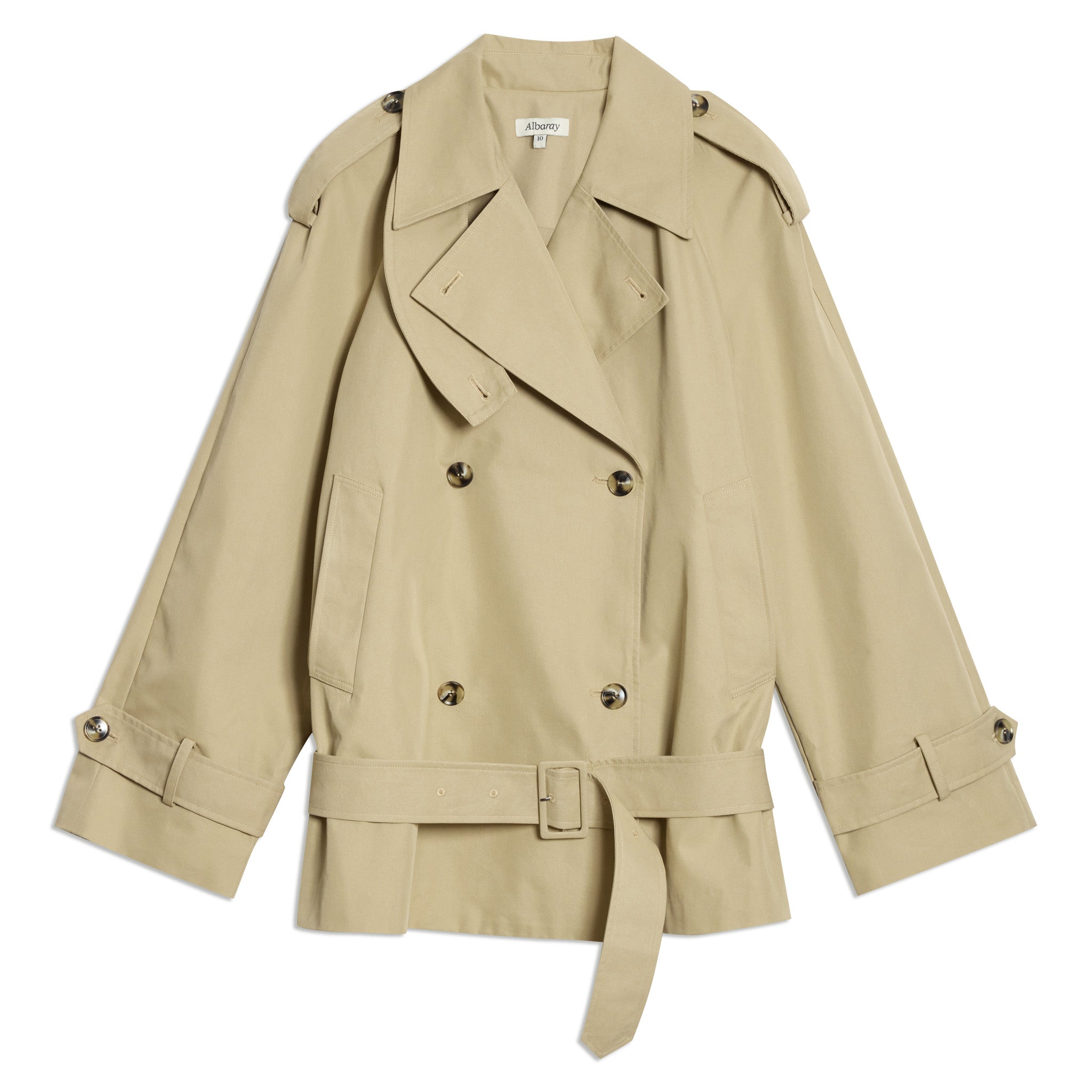 This double-breasted short trench coat is crafted from organic cotton and features a classic storm flap and buttoned shoulder epaulettes for a sophisticated touch. The belted cuffs, and waist add both flair and functionality to this wardrobe essential. Effortlessly versatile, this trench coat seamlessly transitions from winter to spring, making it the perfect choice.