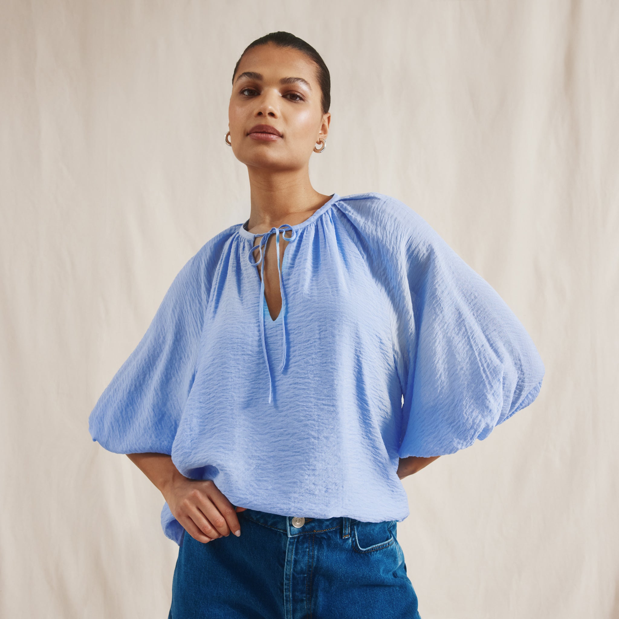 This voluminous top offers a wonderfully airy silhouette that flatters your figure. The gathered round neckline includes a fixed tie that eliminates any fussing with adjustments. The lovely blouson 3/4 sleeves provide just the right amount of coverage while maintaining a light, comfortable feel that moves gracefully with you throughout your day.