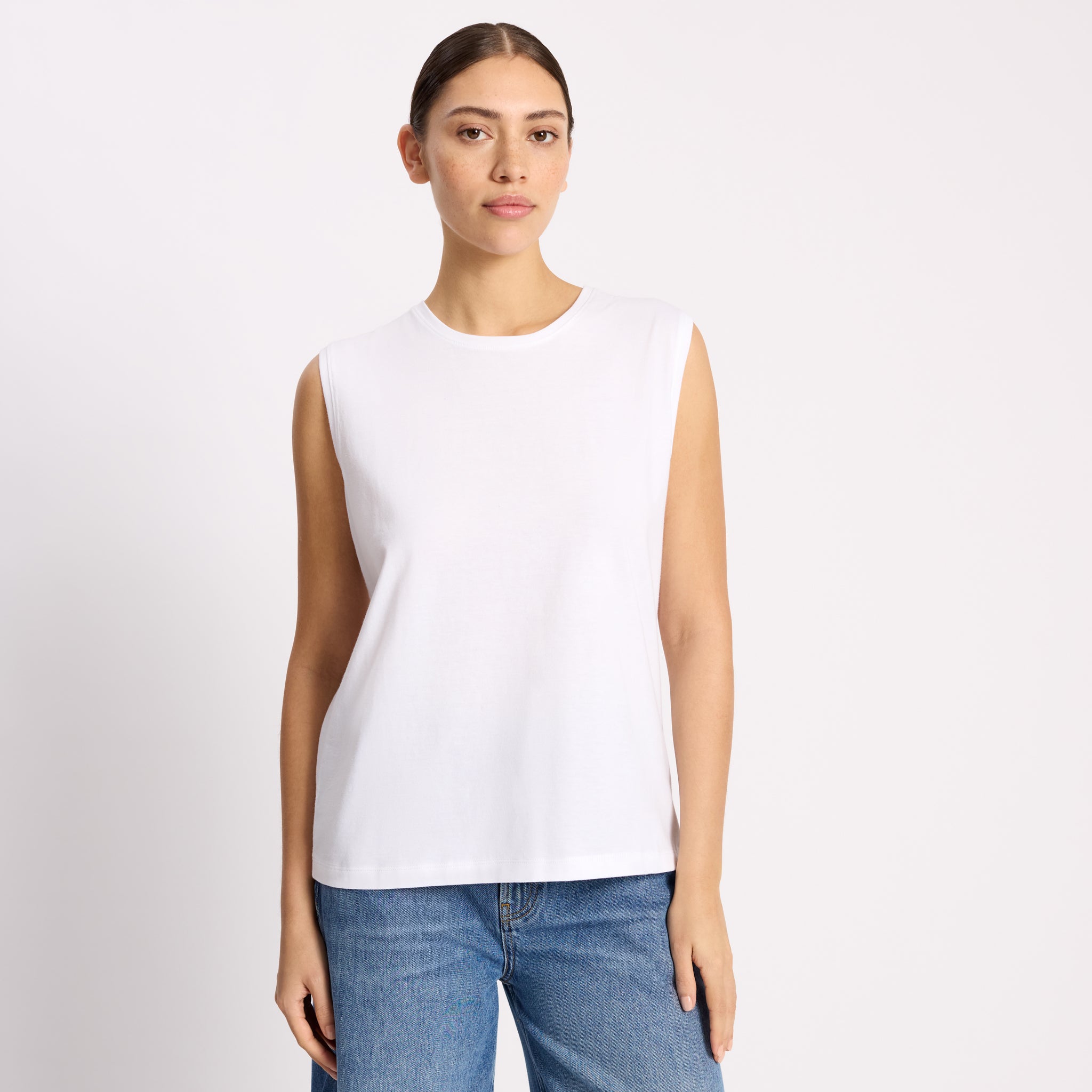 Our sleeveless tank top in white designed with a slightly extended shoulder. Crafted from the softest, sustainable Greek cotton, it is a timeless wardrobe staple.